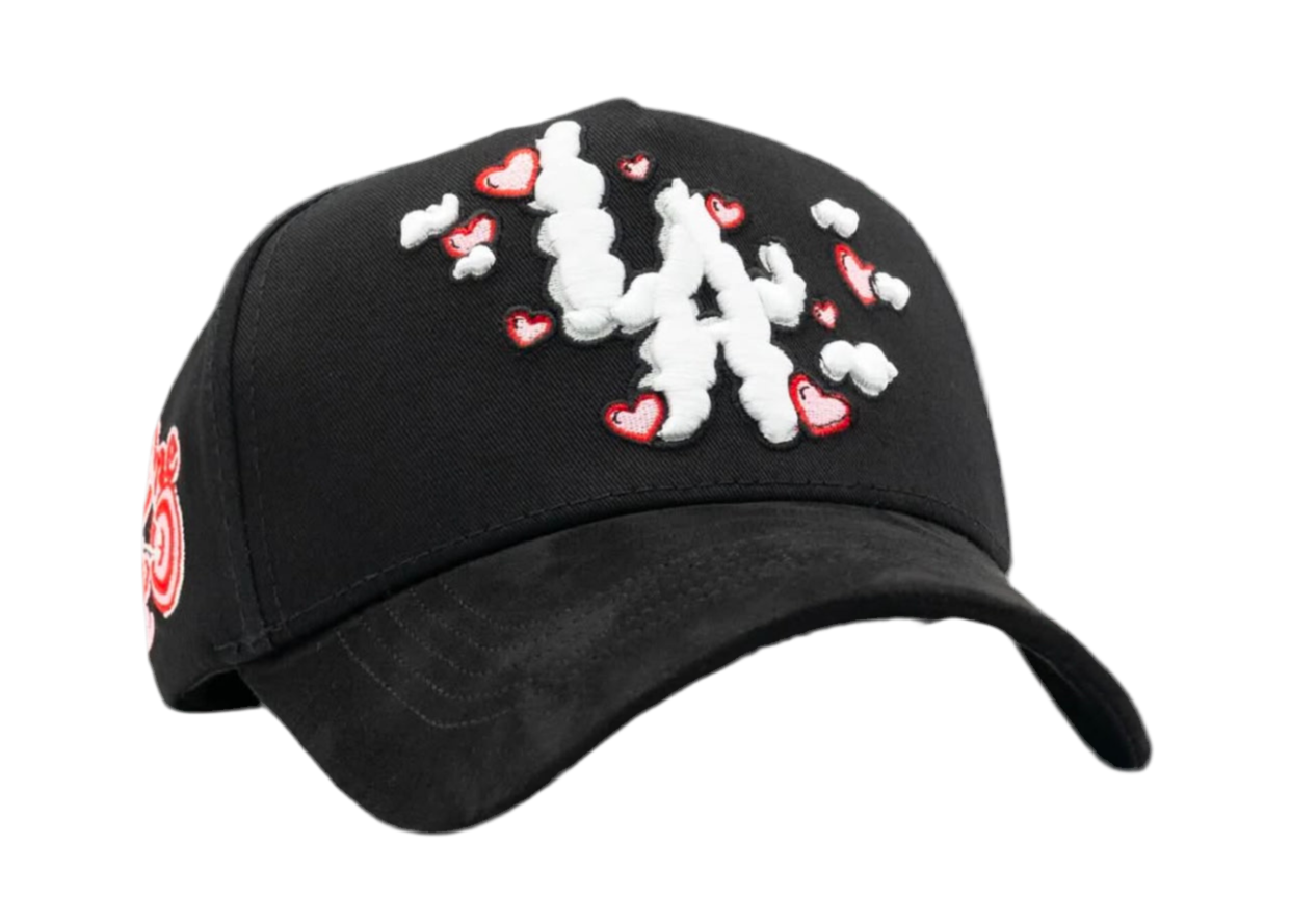 Llavero y certificado, 31 Hats edición San Valentin, talla universal, bordados de corazones, gorra full black con gamuza y chip